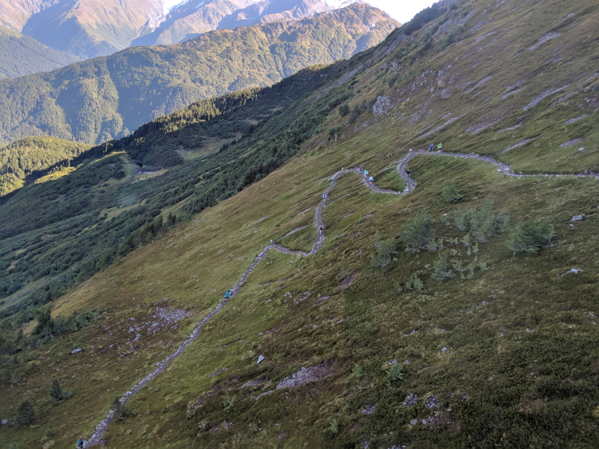 This trail first opened in August 2009. It starts at the base of the tram at Mt Alyeska ski resort in Girdwood, and it ends at the top of the tram. Hikers can ride the tram, free of charge, either up or down. Given the reduction in freebies at Alyeska ski resort in recent years, who knows how long the free tram ride will last.