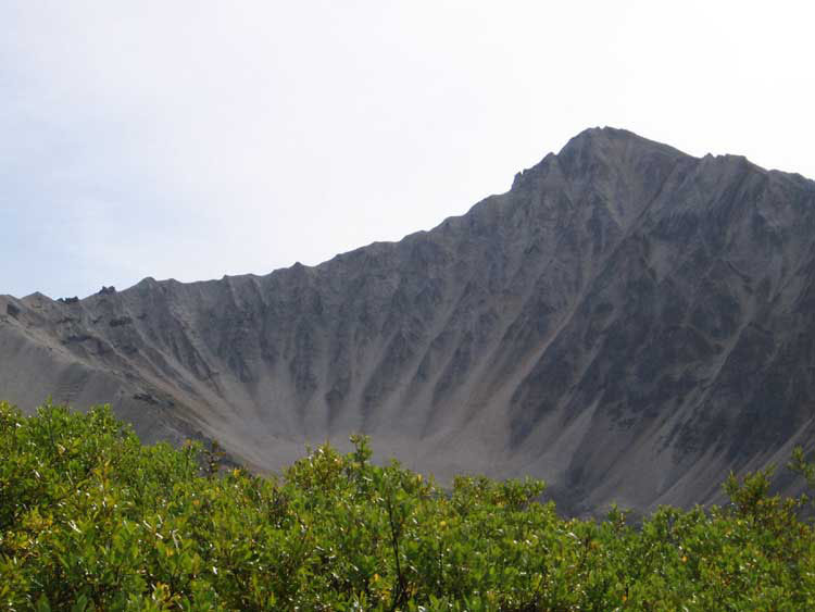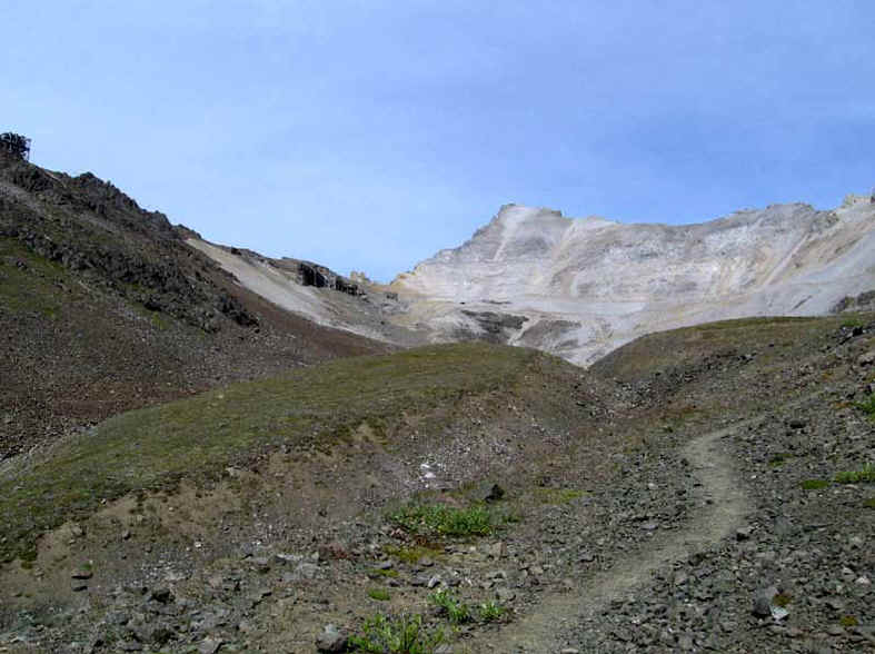 The trail is generally well marked, but there are two intersections without signs. Near the beginning of the trail there is an intersection where you can go straight or take a switchback up the hill. Take the switchback. Going straight leads to the top of the big mining building in Kennicott (worth a look). The second intersection could be confusing on the way down. About halfway up, you'll pass a plausible-looking trail leading right. Although it clearly doesn't go up the mountain, it could lead to confusion on the way down. Make a mental note. The mosquitoes were really bad below tree line. Bring bug spray.