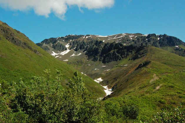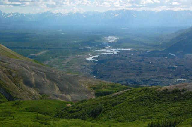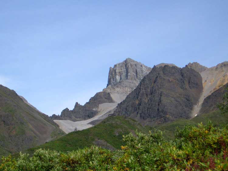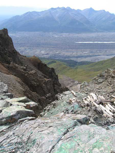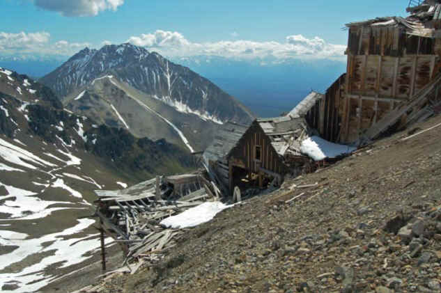 The hike starts in downtown Kennicott. It follows an old mining road the whole way up to the mine. Perhaps the one downside to the hike is that it takes a bit longer to get above tree line than the typical Alaska hike; probably somewhere between mile 2 and 3. Below tree line there are occasional views of the valley; once you get above, the views get pretty impressive. There are lots of old mine-related structures near the trail and nestled in the surrounding hills. Most interesting are the remains of a tram system that carried the ore down to Kennicott from the mines. Bonanza mine itself is a very cool, partially collapsed structure perched just below the ridge. Relics of the early twentieth century are strewn all over. The ridge just above the mine has some great views to the north that are not otherwise visible on the trail. Just be prepared for less than a 360 degree view: the actual summit of Bonanza Ridge towers another 1,000 feet or so above the ridge that the mine is perched on. It doesn't look possible to get to the true summit without climbing gear.