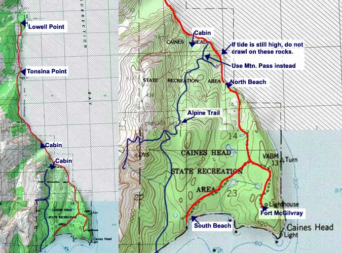 On the hike route are two state cabins (see this link for more information). While they are very nice, one, Derby Cove is set too far back to enjoy the views, and the other closes you off at high tide from exploring the fort, etc.