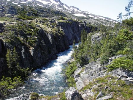 Day four was 8.5 miles of relatively easy hiking again - some periodic ups and downs but nothing like summit day. We got below snow line and the sun warmed things up right away. Neoprene sox came off very quickly. The trail was again easy to follow with bridges over all streams of any size. The trail passes stunning mountains, gorges, rapids, and aqua blue alpine lakes. It is well worth the work to get there! We stopped to check out Lindeman City (another ghost town) and get our official certificate from the Canadian Warden stating we'd crossed the pass, and then continued down trail to Bare Loon Lake Camp.