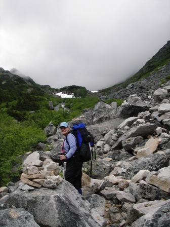 Day two took us another 7.5 miles (including a short side trip to see the actual ruins of Canyon City - not much there - it was a tent city) rising about 750 feet through more rain forest and into sub alpine terrain. Another pretty easy walking day. The views started opening up as we rose in elevation some. We camped the 2nd night at Sheep Camp - a really indispensable stop before you cross the summit the following day. Sheep Camp also has bear lockers and two canvas/log cabins for hikers to cook, dry out, etc. The US Ranger station is also located near Sheep Camp, and the ranger talks at 7:00 pm (AK time) each night to give an update on trail conditions up to and over the summit. He sets trail markers in the snow fields of the upper elevations on the AK side of the trail every day as conditions change - which they do daily. The Canadian Wardens set them on the Canadian side daily. He recommended we all be on the trail by 5:30 am (AK time) to be over the summit and starting down before noon so we wouldn't be postholing through rotten snow the following afternoon. Everyone took his advice.