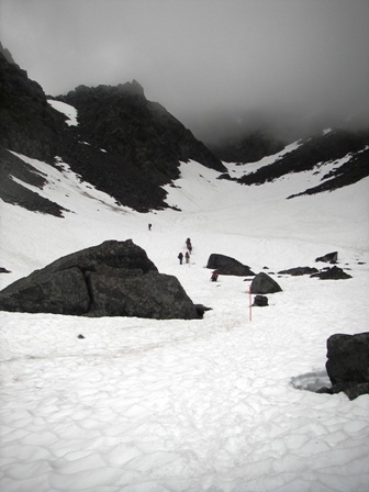 Day three was summit day. The trail rises about 3000 feet from Sheep Camp to the Chilkoot Pass in roughly 3.5 miles. The first 2.5 miles is called Long Hill: a steady uphill from sub alpine to alpine to boulder fields and snow fields. No more well-tended trail with plank bridges over creeks. It was snow melt and mud and left-over avalanches and snow bridges. I was thankful for water proof boots, neoprene socks, and hiking poles. And, oh yeah, it was awesomely spectacular scenery, too. The Long Hill ends at The Scales, where historically gold rushers had to weigh their gear for the Canadian Mounties. The Scales marks the grueling last mile to the summit - the "Golden Stairs". You've seen pictures of it in history books. A line of ant-people crawling up an incredibly steep snow-covered gully between towering peaks. Now imagine the snow is mostly melted, exposing the huge boulders, scree, loose rocks, and abandoned gear beneath. There's no actual trail up it. You just go up any way you can, climbing, crawling, pushing and pulling yourself up and up. Wear gloves, and, if you have any fear of heights, keep your eyes and mind focused ahead and above you.