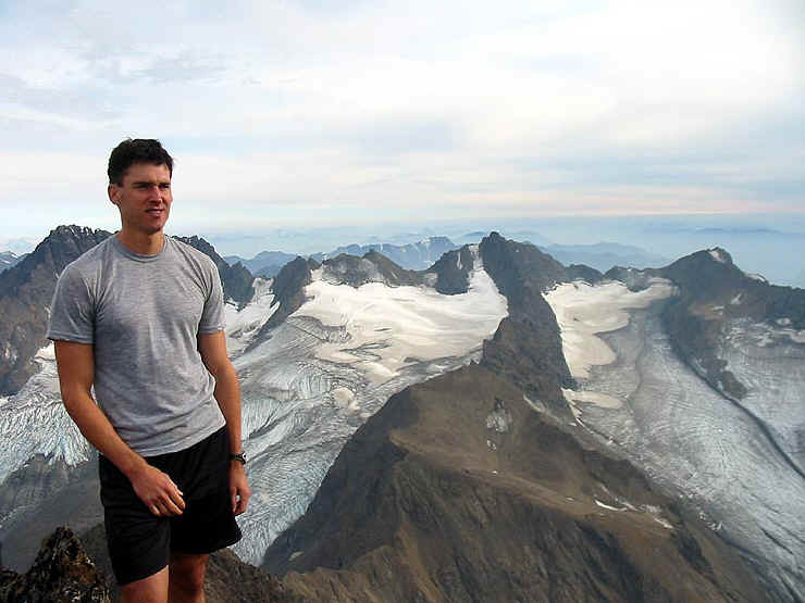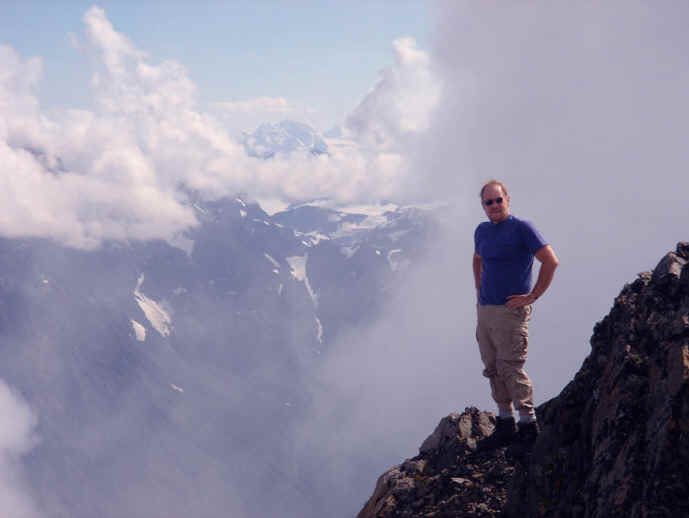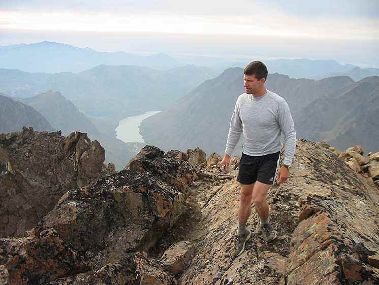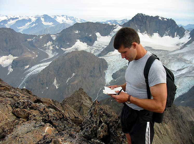 On August 15, 2004, Allen and I were only the 9th and 10th persons to sign the summit register - stashed tightly in a summit cairn - for the year. You will find two pleasant surprises when you descend: numerous routes become visible that weren't so clear on the ascent, and the safest route among them may be chosen; and scree becomes your friend as it cushions you and eases your body on the descent.