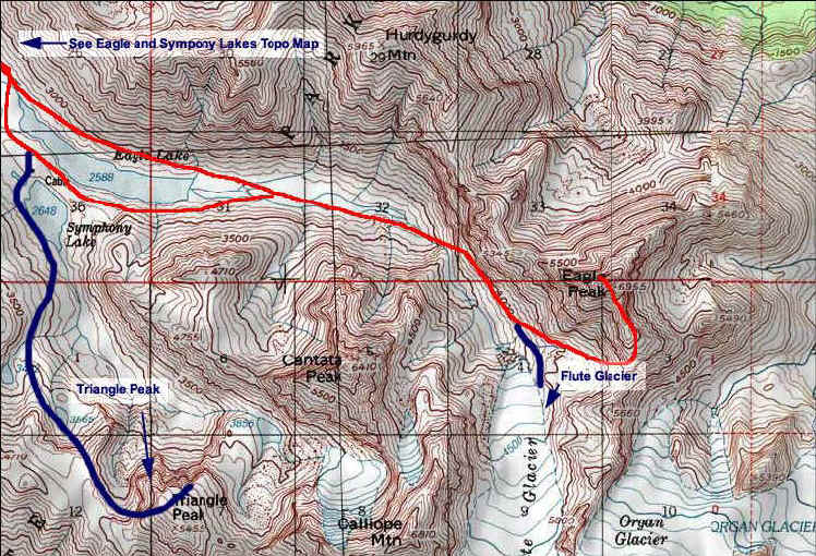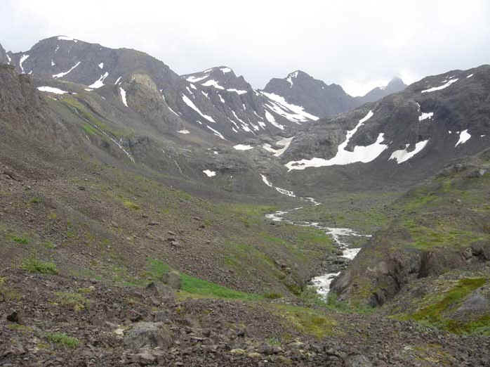 Follow the thinning path between the lakes to the head of Eagle Lake, and descend slightly to the glacier-braided stream feeding the lake. Continue upstream, hopping across braids at times. At last check, some orange flagging adorned the alders here, suggesting an efficient route. After 3 upstream miles, you will climb and bushwhack to the left of a tall waterfall. You will soon feel partly "walled in" from 6,400' Cantata Peak on the right, and big brother Eagle Peak ahead, and to the left.