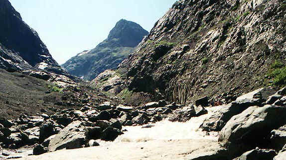 It is extremely dangerous to try and climb over the rocks to get close to the glacier. Only experienced climbers should attempt it. It would be easier to climb up the side of the mountain on the other side of the river. However, the current is swift and icy. You can cross the river if the water level is low enough, especially late in the season. However, be aware that when you come back the river may be at a higher level due to glacial melt. Know how to ford a river before you take the chance. Better yet, go to Search Hikes for more accessible hikes to glaciers.