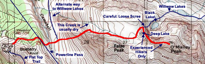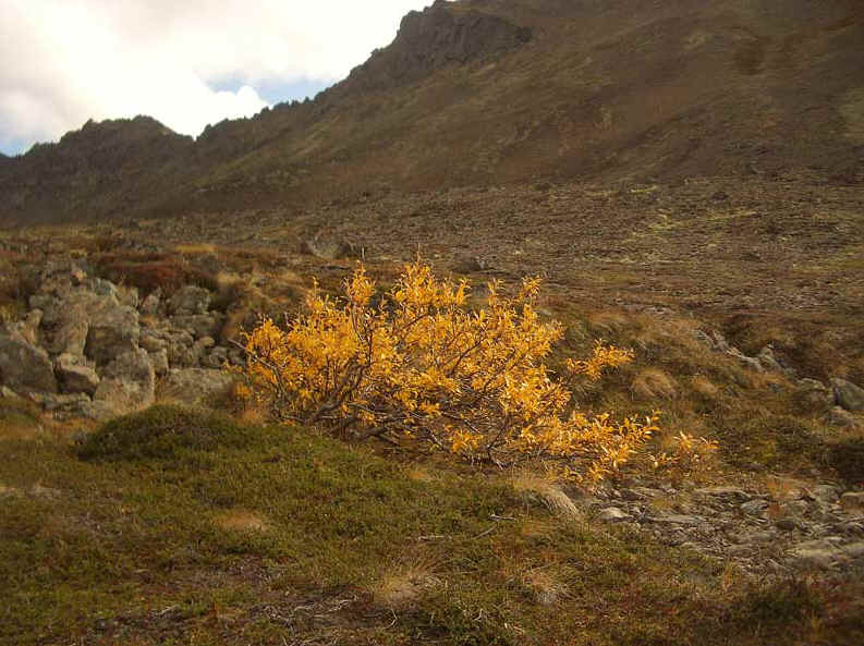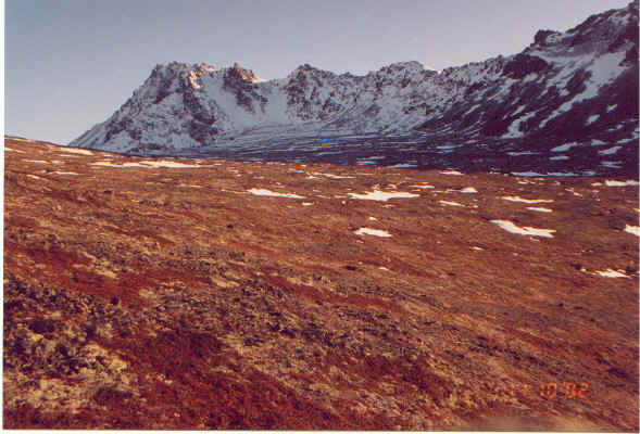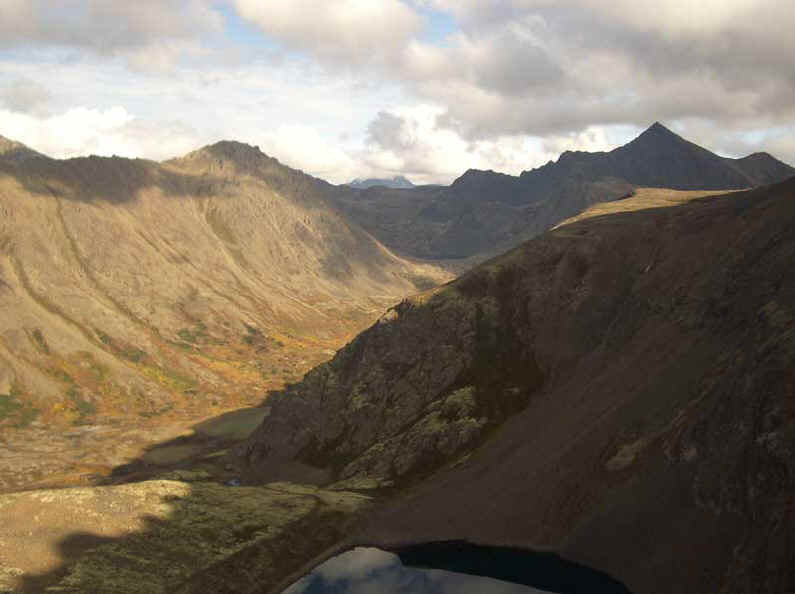 Most people use this as a thru hike to get to Williwaw Lakes but it makes a fine day hike and overnighter in its own right. The climb up to the saddle of O'Malley is a bit tough, but once you get up there, the terrain and landscape features are very unique and spectacular, and worth the effort. First on the menu is a glacial valley that literally is almost as flat and wide as a football field. In the fall, it is a colorful mosaic of rock and scrub. Note: Some people call this area the Ballpark.