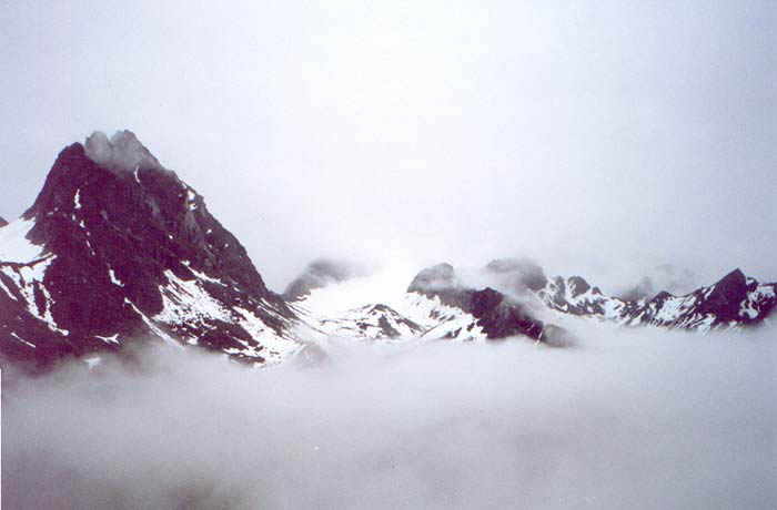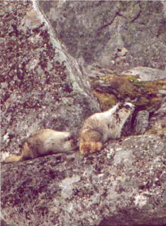 2 really cool things happened when I did this hike. One was that while I was in the hut making dinner, the valley filled up with fog so fast that all I could see were the peaks when I came back outside. The other was during the next morning when I was sitting on the stoop of the hut sipping my coffee and two hoary marmots sat on a boulder close by watching me and chattering away. Go to the photos page for visuals on these.