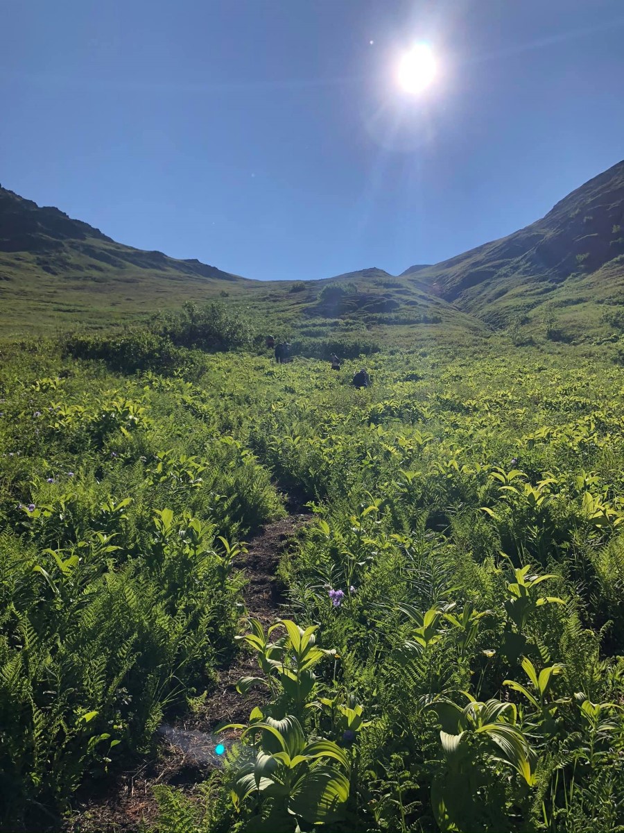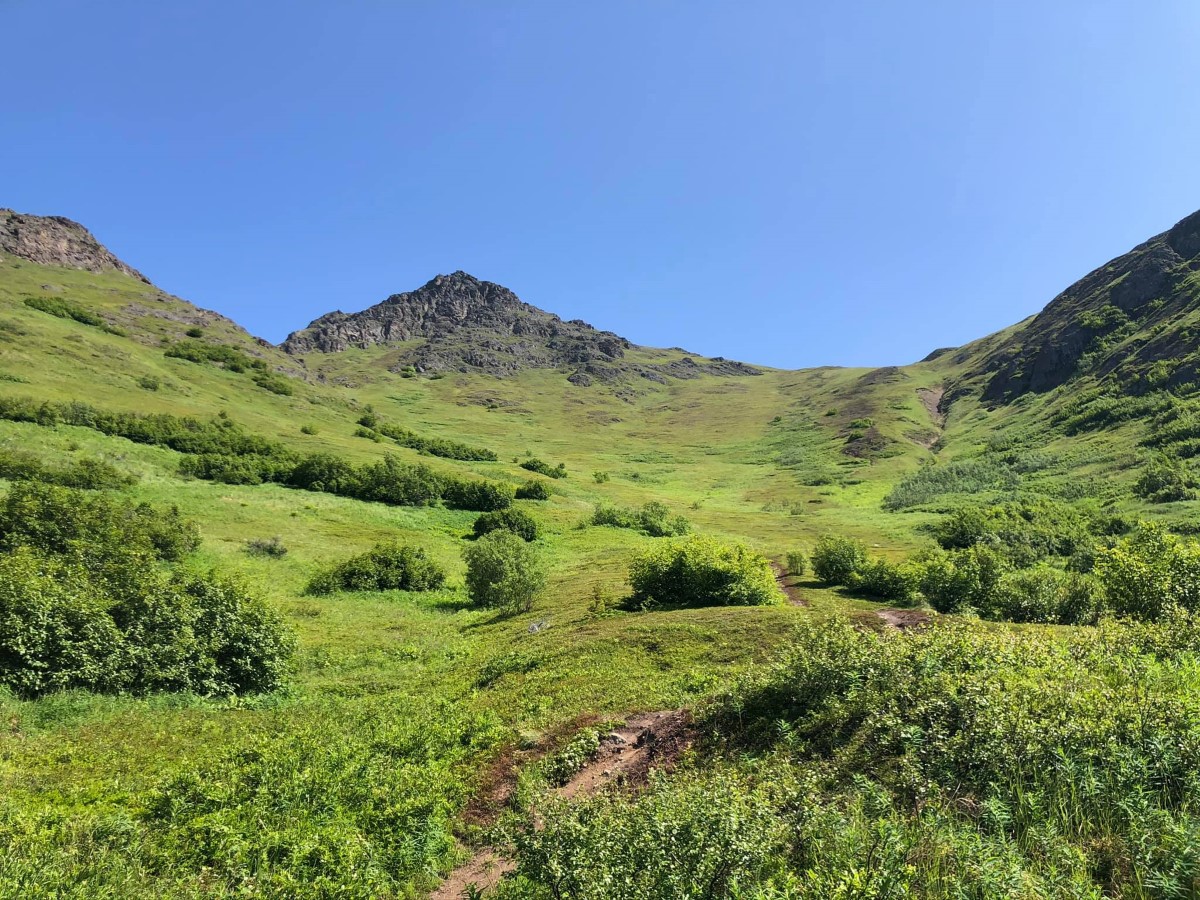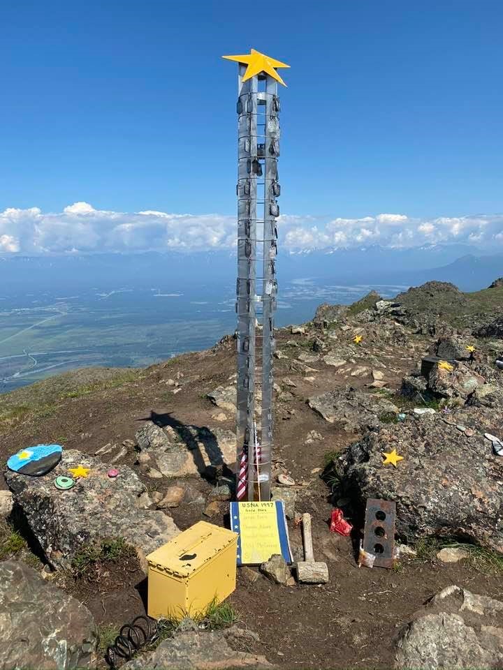 This hike is fairly unknown to the general public and can be difficult. The trail starts just after mile 4.5 on Eklutna Lake Road. The closest parking is in a small pullout along the road, specifically at electrical pole 85. From there, you must walk about 1/2 mile further down the road to find the trailhead. There is survey tape marking a steep trail for about the first 1/2 mile. The trail mostly levels out into a field before continuing an uphill climb. Stick to the right as you make your way across the field and continue climbing to the summit. At the summit there is a plaque and other items dedicated to Gold Star families. There is also a tower filled with dog tags left by loved ones who have made the trek to the summit.