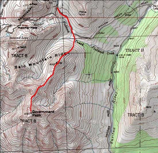 July 12, 2005 - I hiked a total of 5 hours to reach the summit of Government Peak and back. I started my hike from the parking lot at mile 17 on Hatchers Pass Road, which is on the right about 2.5 miles past the Gold Mint Trail trailhead and the Mother Lode Lodge. This year they started a parking fee of $5.00 a day to pay for recent road improvements and new campsites. From the parking lot, I headed southeast across the road to find a partly overgrown trail that leads down the embankment on the other side to an old cabin and then to Fish Hook Creek. I followed the trail down the creek short distance until I saw pink flagging on the far side that marked a wide and shallow ford.
