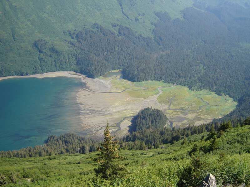 The trail ends at a cove off of Tutka Bay known as South Grace Ridge trail head.