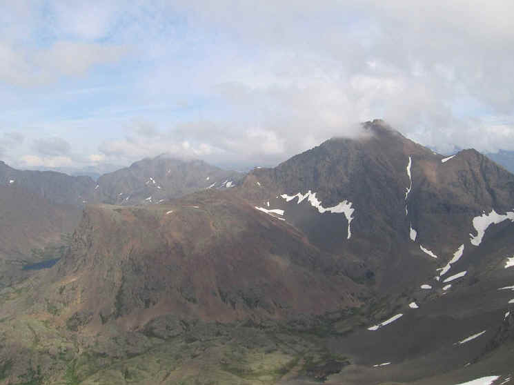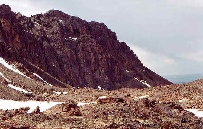 On the south side, a huge jagged mountain known as The Wedge dominates a reddish rocky terrain that almost seems Mars like. Off to the side is a small lake.