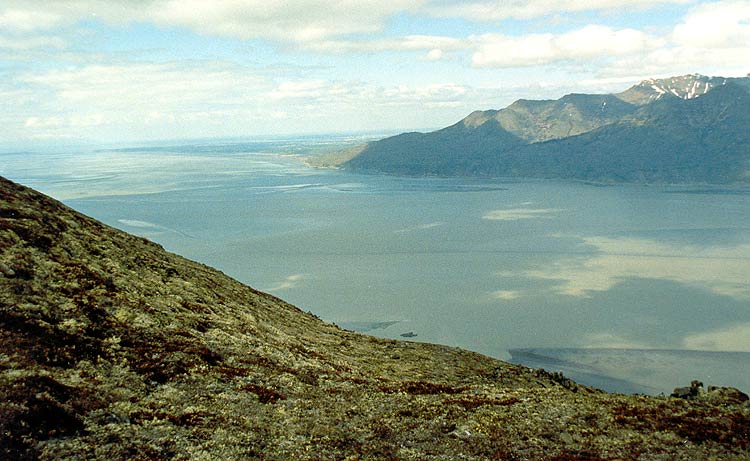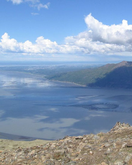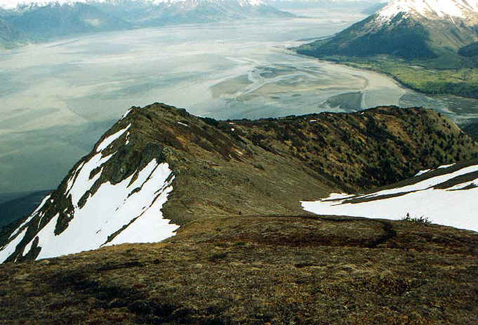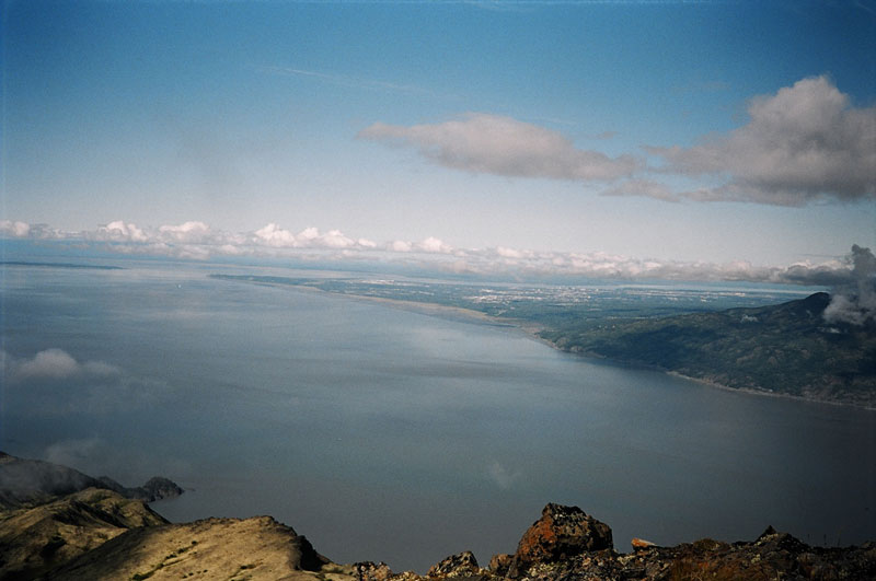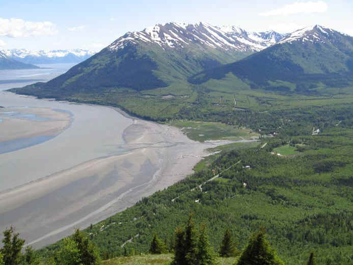 This is one tough hike. If it were any more steep, you'd be Batman and Robin climbing up a building. They didn't even have the courtesy to put in switchbacks. But if you're in shape and up for the challenge, I highly recommend this hike for its excellent views of Turnagain Arm, the city of Hope and Resurrection Valley, and as you get to the top, the Kenai and Chugach Mountains. You'll also get a faint view of Anchorage across the Arm.