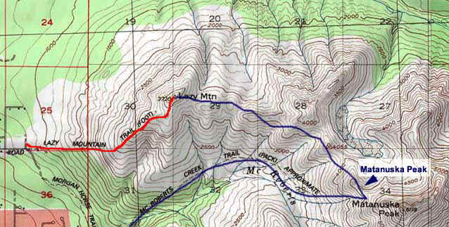 Lazy mountain, near the city of Palmer, makes for a fine day hike. From the parking lot at the base, the trail ascends rapidly through dense foliage over a well-trod path. The trail continues straight up the mountain for a good length, with occasional steps built right into the path. A third or so of the way up, a bench is reached. After this, the trail becomes slightly less steep, and the landscape changes from forest to rocky tundra. Another bench is located just below the real top of Lazy mountain. From the final vantage point, one can see nearby Matanuska Peak, as well as Pioneer Peak and Twin Peaks to the west.