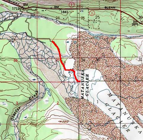 Take the Glenn Highway just past the Matanuska Glacier Rest Stop (about mile 100). You will see a small grocery store on your right with a road just after it. Take a right on that road and head down into the valley. It is rough and steep and a bit harrowing but otherwise fine. Continue across the valley and over the bridge. A little ways from the bridge you will see a store. Get your tickets there and continue down the road to the trailhead.
