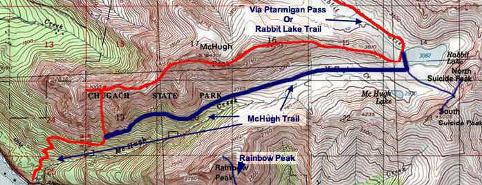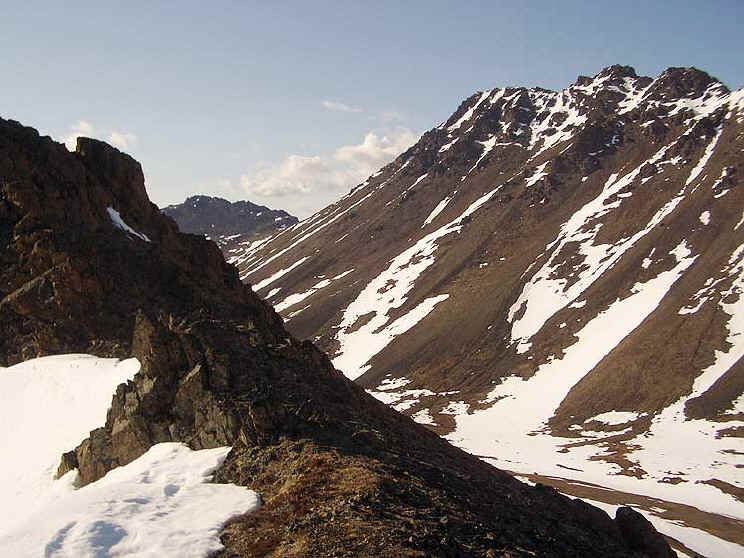 As the book says, McHugh Peak is really just the high point on the ridge, but you will know when you get to the top. The view is great from the saddle on - all of a sudden you get the full picture of how Rabbit Creek Valley and Ptarmigan Pass ties into the ridges and peaks along the Arm. In fact, you could easily do Ptarmigan Peak in a long day as the two ridges collide visibly from McHugh's summit.