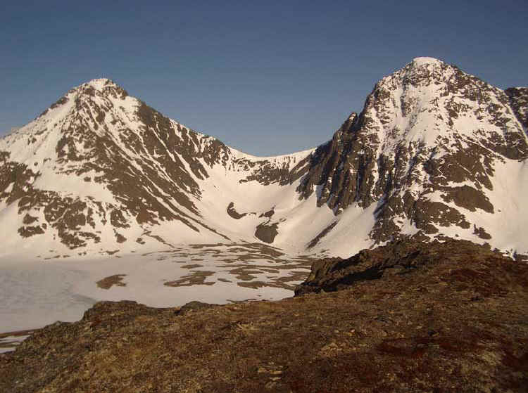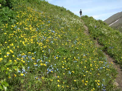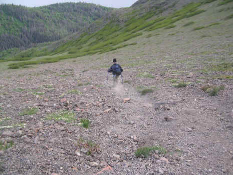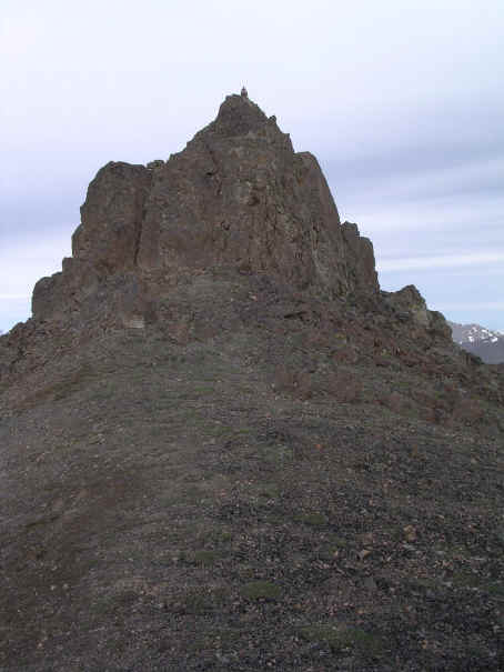 So, you see the main gully mentioned in the book and then start to follow the side trail up a rocky ridge that is just to the left of the gully. The trail is pretty clear. Eventually you get off the ridge and onto a steep slope up alders and alpine tundra (you do not have to bushwhack). Another major ridge should be to your left. The trail then turns straight up towards the gully's saddle. From here on up (it took about 35 minutes from the turnoff to the peak, pushing hard) you are either slogging through scree or stepping from tussock to tussock. Eventually the alpine tundra also falls away and it is just you and the rocks. I choose to go to the right and boulder up rocks to the saddle. At this point you turn right and traverse a very rocky ridge to the "peak".