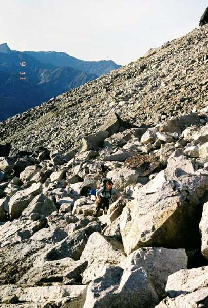 You will climb up the broad scree slope to Backdoor Gap, approximately 5715' above sea level. I have heard conflicting reports of which scree chute leads exactly to Backdoor Gap, but am convinced it is the easiest-looking of the two choices. A more sinister route is off to the left of the "real" Backdoor Gap, so just go up the broad, "bouldery" scree slope. It is actually pretty fun bouldering up the slope, but BE CAREFUL as the rocks are not always as stable as they might appear to be. Although there is little to no risk of mass movement of the scree, individual boulders can often roll underneath you with no warning.