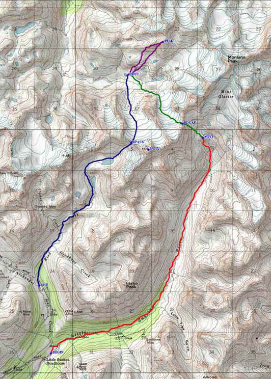The trail is fairly well marked, and the first day's walk is very easy for 90% of it. As you get near the head of the valley, the trail starts heading uphill. Stay on trail and you will not miss the Mint Hut, built and maintained by the MCA. It is about 8 miles to the hut with just about 2600 feet of elevation gain. Enjoy a warm cup of Joe as you watch the sun set on Montana Peak.