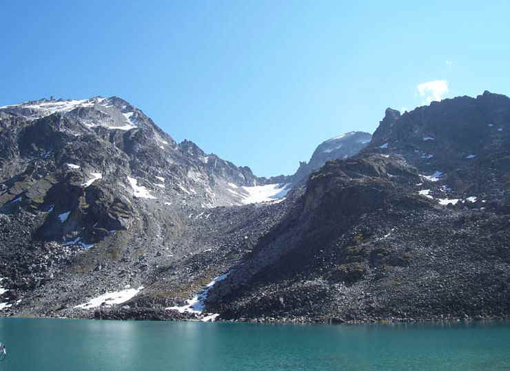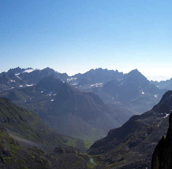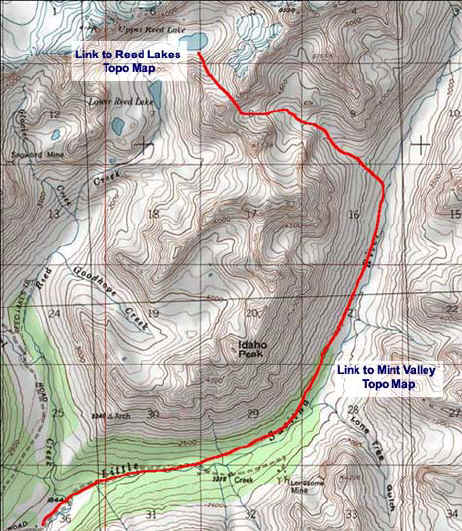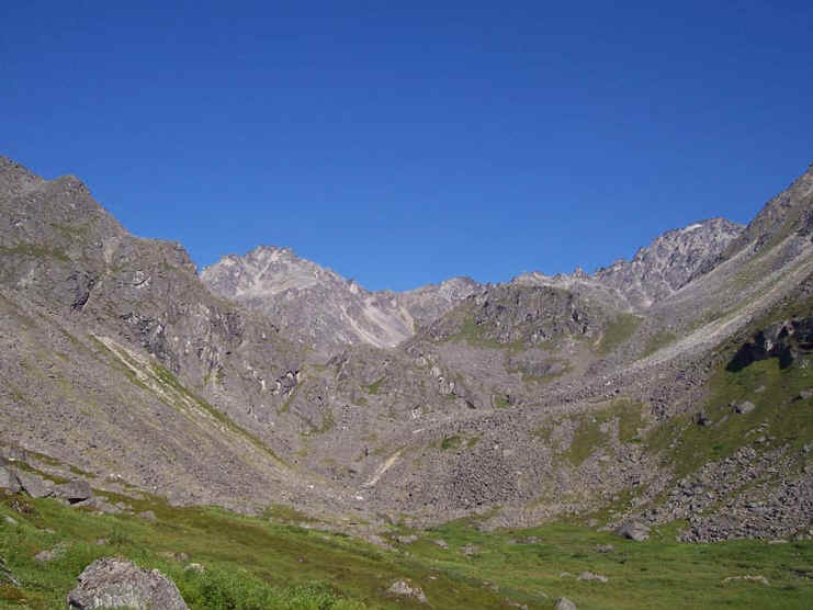 This hike begins at the Gold Mint Trailhead AKA Little Susitna Trail. Follow trail approx. 6.5 miles in then hang a left at the huge hanging valley. This is where the bushwhacking begins and continues for about 200 feet. Follow the valley up and to the left. It will terminate at a saddle/ridgeline. Crest the ridge and you should look down upon upper Reed Lake. Glisade the snow slope below to the lake, then follow the Reed Lakes trail back to the road. Round trip distance is approx 15 miles. I did this hike August 13th 2005. Take plenty of water and a filter.