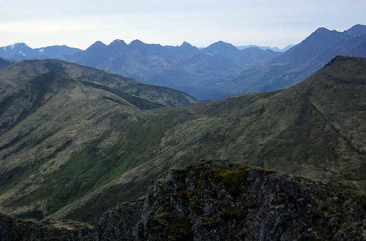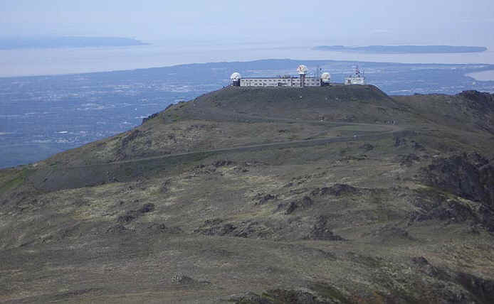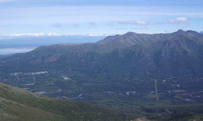 Once you easily get to the saddle (from Arctic Valley Rd.), and a quick hop to the peak, you will have an outstanding 360° view. Herein, starting north: Denali and the Alaska Range (on a clear day) Knik Arm, an old Military site, Highland Mtn, the town of Eagle River, the north fork of the river, its surrounding peaks (Magnificent, Baldy, Black Tail Rocks, Harp, Vista & Roundtop), Eagle Glacier, the south fork of Eagle River with Eagle and Symphony Lakes in the distance, Rendezvous Peak, Ship Creek and Indian Valley, Anchorage, Turnagain Arm, and the Cook Inlet.