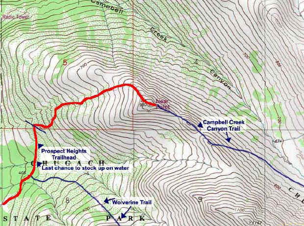 There are a whole lot of criss-crossing trails before you get to the Near Point Trail proper from the Prospect Heights Trailhead. You basically want to head down the valley over the bridge, then curve around and back up. You should see the sign on the right a little ways after the Wolverine Trailhead.