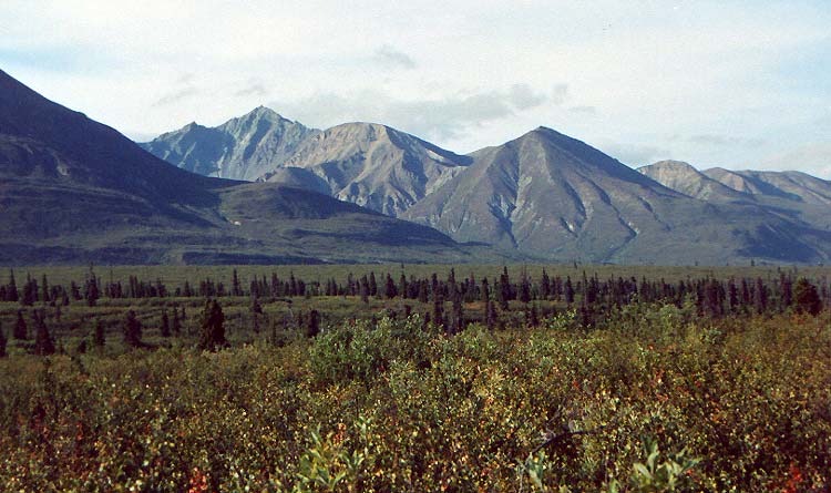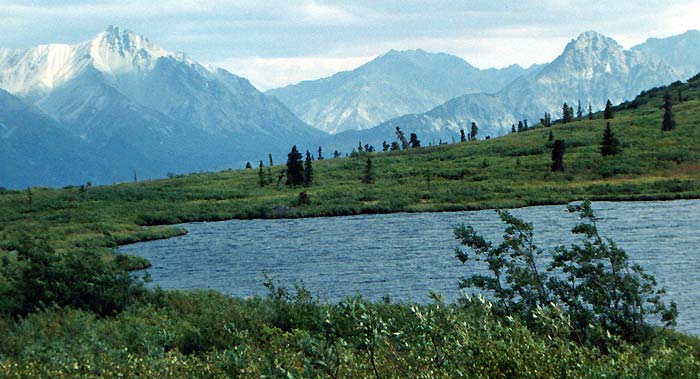 Here's where the bummer part for me was. I had finally got up to the mountain and was about to head down into the valley when I suffered one huge allergy attack! Unfortunately, when this happens to me, I have no choice but to find the first good campsite I can since my breathing is severely restricted. I found a nice site by a lake (Goober) with a beautiful view of the gray steel mountains in front of me and the valley lying below. To the north, you can see the Talkeetna Mountains. But it was a bummer not to see the glacier. I know I will make it the next time.