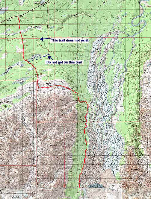 The topo map is pretty straightforward (You'll definitely need Anchorage D-1 and C-1). Someone who seemed to know the area told me the eastern trail is non-existent. Besides that, trust the topo map and use the lakes as landmarks as you head up the mountains. After passing through Long and Shallow Lakes, be careful. I started heading east on a trail that I assumed was new and quicker. I was very wrong and wasted 2 hours. Always take the trail that heads south until you get to the mountains (please go to the map page for visual examples).