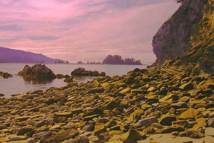 The hike starts by taking you through a forest of devil's club that actually looks like your walking through hobbit territory (no getting tangled in it - the trail is well maintained). There is an exhibit showing a cross section of a tree and how boat knees were used to make fishing boats before the age of fiberglass. After a series of boardwalks, you get to the gravel beach and from here you can explore the tide pools and hike over to other adjoining coves - tide permitting. It's good to keep track of the tides if you are going to do this.