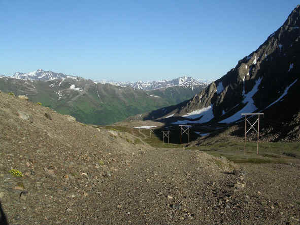 Powerline Pass is basically a beat up dirt service road where the power line crosses over the Chugach Mountains. The main section goes through the Glen Alps where many wonderful hikes can be found (see below). While the scenery along this road is very beautiful, the dirt road and power line can really detract from it. However, it's a great mountain bike trail, and in the winter, a great cross country skiing trail. Going over the actual Pass is quite exhilarating as the trail narrows up a steep ridge.