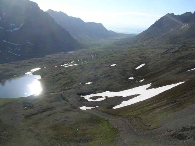 Many residents on the east side of Anchorage access the lower part of the trail from various trails and moose paths near their homes, but there is no reason for visitors to venture to this part. The best section starts from the Flat Top parking lot. and goes right up to the Pass, where there is a small tarn (lake). As you head toward this section, the terrain gets rockier with less vegetation as you are literally crossing over treeline.