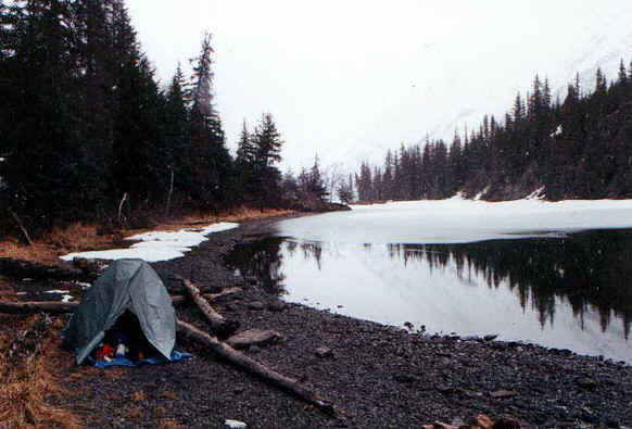 Haven't been here in awhile. I really wanted a reason to drive down the Arm and camp out somewhere and I knew this place would be snow free. They cleaned up a lot of the dead trees by the lakeside trails and I discovered a campsite that I didn't know existed. It was a great site on a cliff with a great view of the lake. It's just about 75 yards down the trail where the lake starts. I did hike almost to the end of the lake but then turned around realizing this site on the cliff was where I really wanted to stay. I had a great book and it was a real peaceful time. Since it was lightly drizzling on and off, I got to setup my new siltarp canopy.