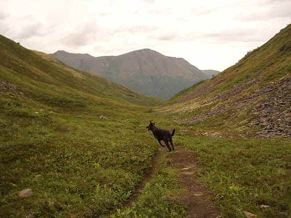 From the Arctic Valley side: the trail is a relatively easy (kid and dog friendly) walk up. It is lined with berries in August. In the winter it is a great cross-country ski trail that will challenge at times. I believe that mountain bikes are allowed although I did not see any tracks. I am unsure of camping restrictions.