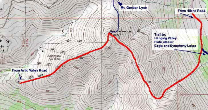 The Arctic Valley trailhead is at the end of Arctic Valley Road, adjacent to the Alpenglow Ski Area. Take the Glenn Highway to the Arctic Valley exit and follow the switch-backing road for about seven miles to the parking area run by the Anchorage Ski Club. Note that there is a $5 parking fee at Arctic Valley. Your State Park Pass is not valid here.