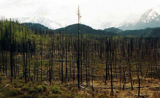 However, between the sights is something less than desired. Half the time you're under canopy which is not what, in my opinion, Alaska hiking is about. Although the trail is well maintained, this means lots of sawed down trees which I personally find distracting. The forest service is also doing a moose reclamation project. Subsequently, there are controlled burned areas of spruce in order to bring back the willow and the aspen. It is not a pretty sight.