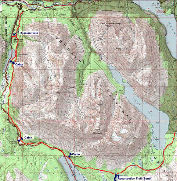 Note: as a day hike to the falls or Lower Russian Lake, the trail is well maintained and is ideal for disabled, elderly, or very young people.