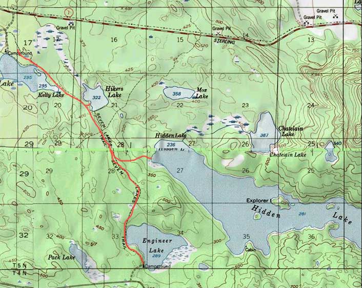 First off, a little truth in advertising; this is really only a 4 lakes tour. The trail was cut off due to Skilak Lake Road being built and there were 3 others north of the road. From north to south the 4 lakes are; Kelly, Hikers, Hidden, and Engineer. When I did this trail I hiked it south to north since where I camped was closer to the southern trailhead.