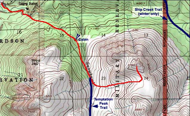 Other then the usual restrictions regarding Ft Rich, this area is awesome. It is a fairly easy hike (I did it in March with snow shoes) however there is some bushwhacking involved. Once on top of the saddle there is a rim which makes it an easy ascent up the southern, higher hill (elevation 3990). The northern edge of Ship Creek Hill is very steep and is one of the dominating hills that can be seen from the Ship Creek area. It is one of those hills that screams "climb me". Land navigation is fairly easy however you must be careful not to overshoot Snowhawk Creek Trail on the way back or else you will have to do some backtracking (the best bet is mark the trail on your GPS). This is a great first "off trail" hike to test your back country skills without a lot of the worry.