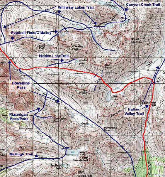 Be aware that via Indian Valley you will encounter many sections that will require you to bushwhack. Try to stay on the upper sections of the mountain ridges till you get halfway up Ship Lake Valley where the terrain turns to scrub. Be warned: Indian Valley can be clogged with snow right up to mid June. I usually pack snowshoes just to be sure.