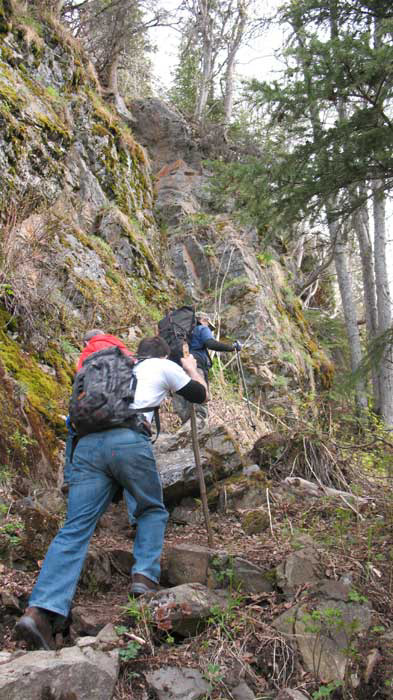 From the Sterling Hwy, the trail rises rapidly. The elevation rises 1600 feet from beginning to end. I'm not sure what to believe on actual trail length, since the sign says 1 mile and hikers have clocked 2+ miles. Either way, it's a steep trail at times.