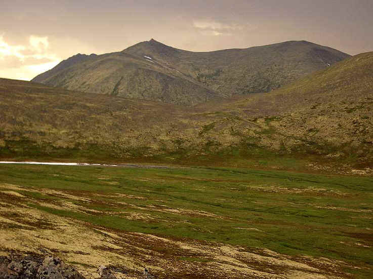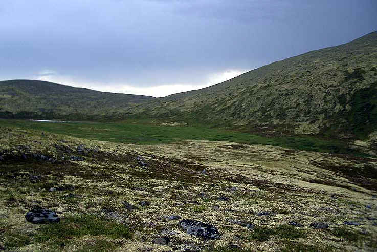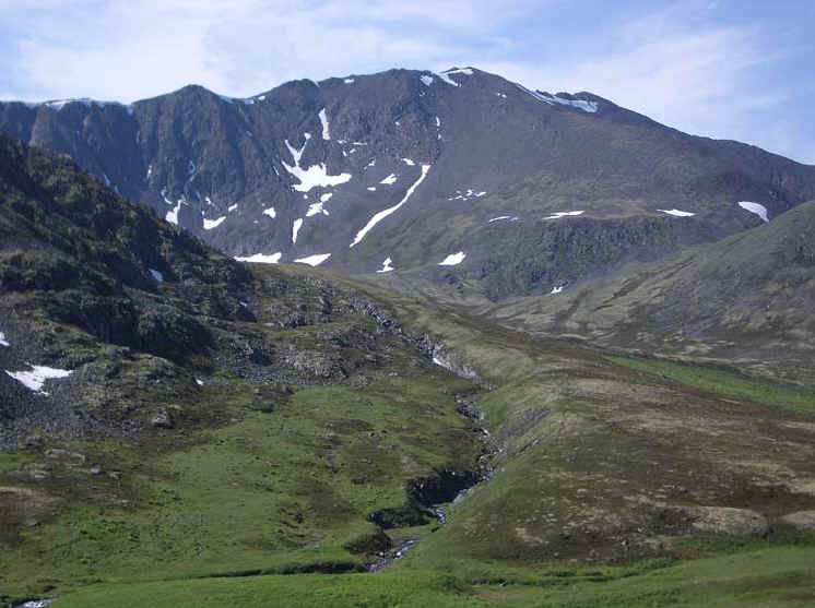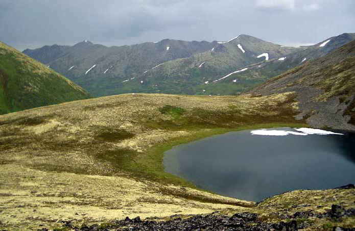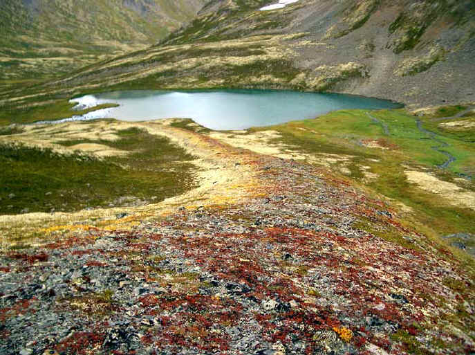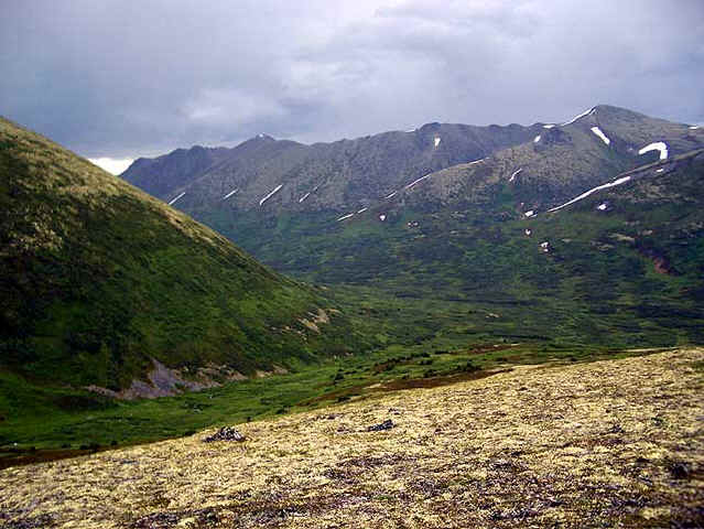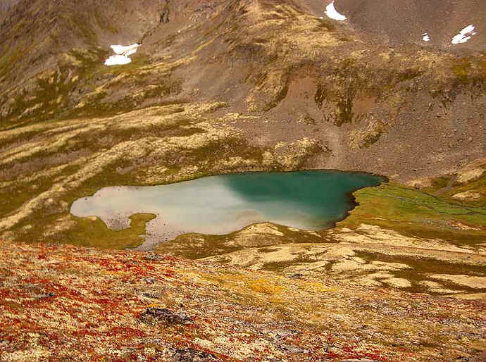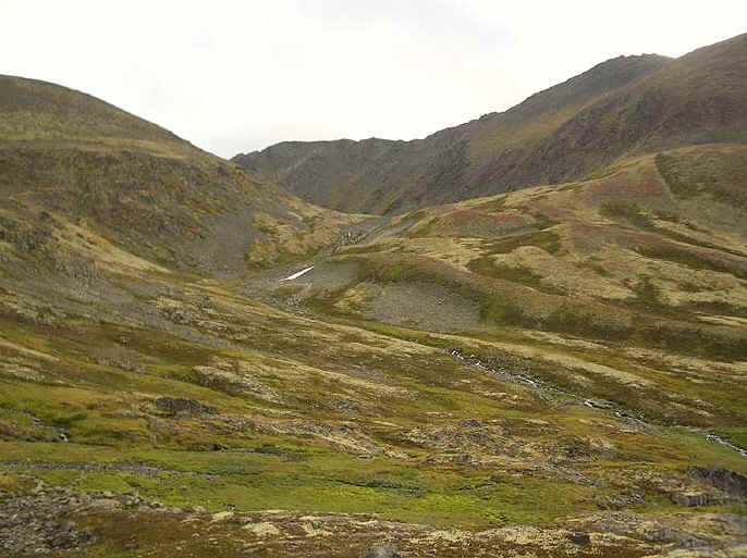 I also met a hunter and his son who told me that there is always a good chance of seeing caribou up at the top of the highest mountains in the region. He also let me know the mountain I camped near (before the saddle into Resurrection Pass) is an inactive volcano and the mound of rocks near the tarn was where it erupted. Since I had been there, the lake had dropped 2 feet. He told me 2 weeks ago that gas was bubbling up from the below and that's when the water dropped...cool!