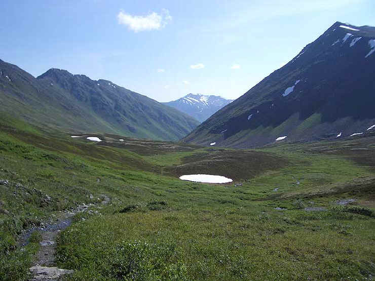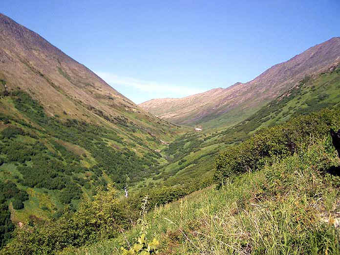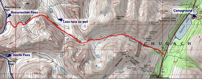 The trail would make a great, almost-loop hike with Resurrection Pass and Devil's Pass. If you didn't have another car, the two trailheads are only 3 miles apart on the Seward Highway. An overview link is provided on the Map Page. Car-wise, this would be a lot easier to deal with than the whole Resurrection Pass Traverse. You can do more of the Pass than just the section between the other two trails.