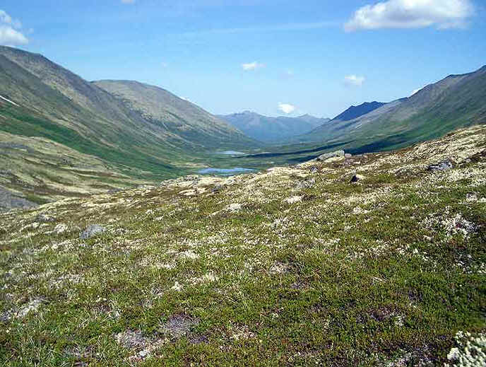 There are plenty of places for solitude with lots of hidden tarns, and moraines to camp behind. The opportunities for exploring and day hiking after setting up camp are endless! Most of the surrounding mountains and terrain are very accessible with gentle slopes to their summits. There is endless soft tundra scrub to make camp on. My favorite is the white, coral looking scrub, known as chalcodonia, which is firm like a mattress.