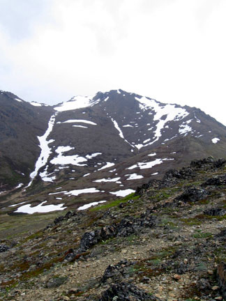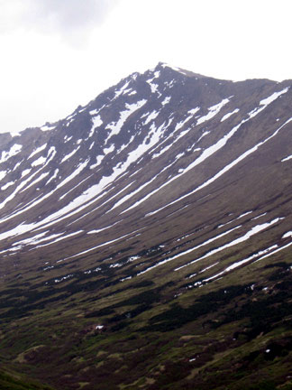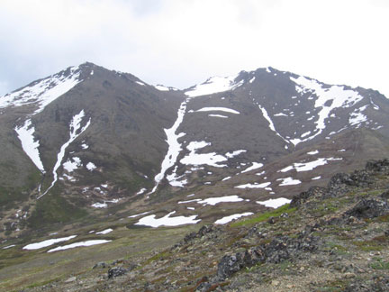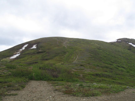 The trail has lots of spruce bark kills, which is opening up the views a bit. The gradual trail goes through the trees and some grassy meadows then finally starts to climb steeply until you get to the lookout below The Dome proper. From here you can just trudge up to The Dome, following along an old, very eroded jeep trail. The "top", or The Dome, is actually just an extension of the front ranges, leading to bigger and better things. It would make a nice alpine campsite, or a picnic area. Its appearance is like a large, mellow Flattop with more tundra than rocks, and less people typically than at Flattop or Near Point. The elevation at the Dome is about the same as Near Point.
